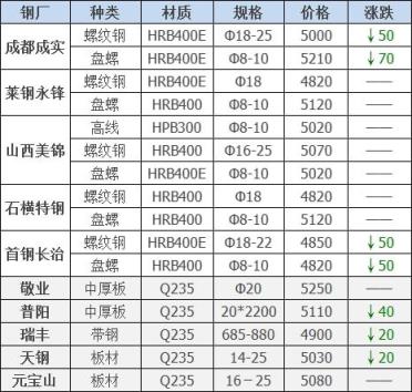 下調5家,占比50%,調價幅度20-70元/噸;